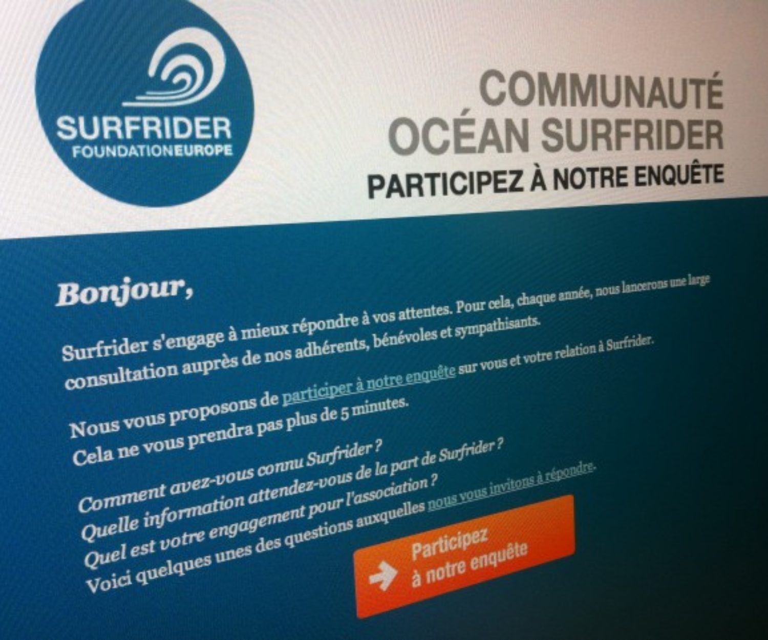 NEWS 05 Nov 2011 Surfrider Foundation Consultation… please take a minute ! Surfrider s'engage à mieux répondre à vos attentes. Pour cela, chaque année, nous lancerons une large consultation auprès de nos… Greg PENNE No Comments